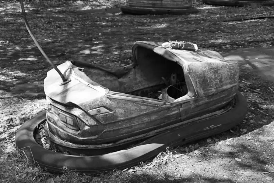 Dodgems lay rusting under their metal roof with plants and weeds growing up through the floor. Above everything, the Pripyat Ferris wheel stood eerily silent with the cars rocking slowly in the gentle breeze.